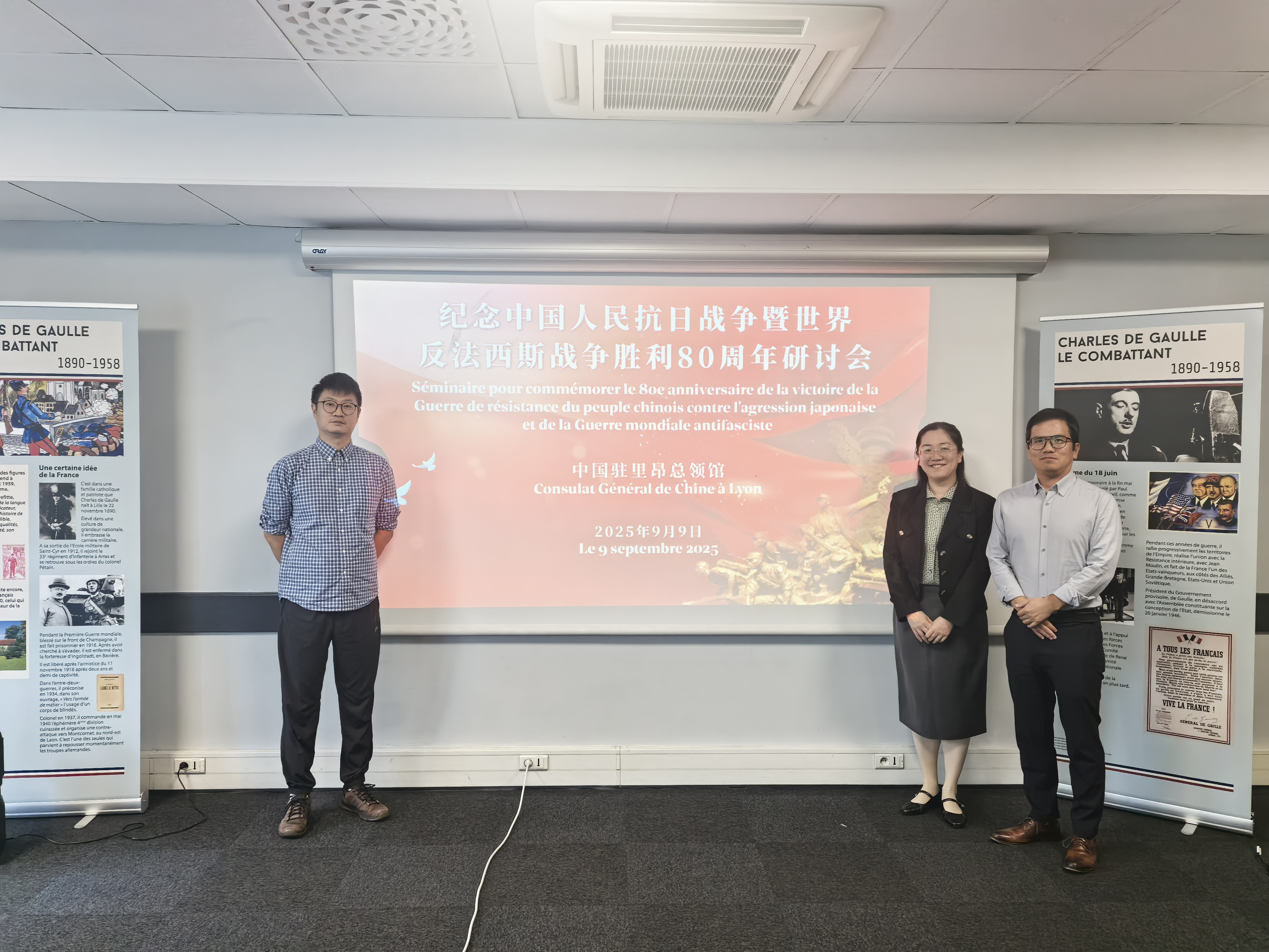 2025年9月9日,中国驻里昂总领馆成功举办纪念中国人民抗日战争暨世界反法西斯战争胜利80周年研讨会。来自中法两国的专家学者、当地政府代表、友好人士及华侨华人约50人出席。太阳成集团tyc234cc副院长姚霏教授携刘峰、蒋杰两位教授应邀参会并作专题报告。此次研讨会也是继“2025中法论坛:多元视角下的第二次世界大战”在太阳集团tyc234cc成功举办后,中法两国在二战历史研究与人文交流领域的又一次重要合作,形成了“双城会”的良好格局。